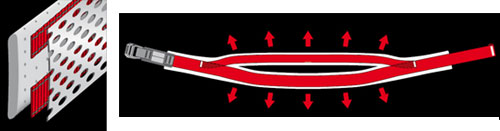 Durch die grosszügigen Längsöffnungen zwischen den beiden Bändern und die Wahl besonders atmungsaktiver Materialien wie gelochtem Polsterschaum und Mesh- Fabrics wird eine angenehme Atmungsaktivität erzielt werden. |