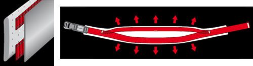 Durch die grossen Belüftungsöffnungen im Splitbereich des Bandes und den Einsatz besonders atmungsaktiver Materialien bieten die Zephir- Gurte höchste Atmungsaktivität bei sehr geringem Gewicht. Bei den Gurten der Togir- Linie hingegen wird das Split Webbing in einem aufwändigen Laminierprozess mit den Polstermaterialien und Aussen- und Innenfabrics verklebt. Hierdurch entsteht ein sehr flaches und cleanes Gurtdesign. ![]() |