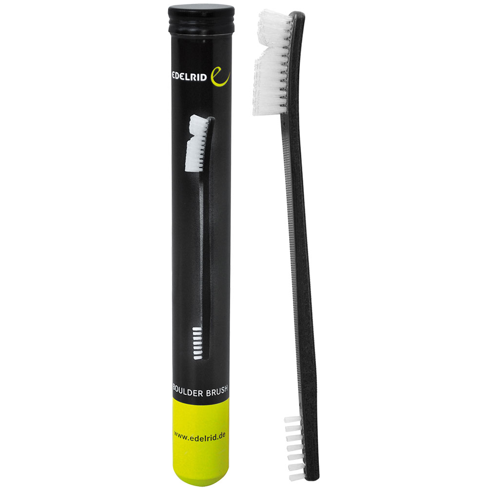 Die extrem robusten Borsten sind ideal für das reinigen von Griffen und mit den zwei unterschiedlichen Kopfgrößen gelangt man problemlos in noch so kleine Fingerlöcher und Leisten. Super bei Fingerlöchern! Die Edelrid Boulder Brush ist die ultimative Kletterbürste, mit ihr wird garantiert jeder Griff sauber. - Eigentlich putzen die Rekruten der US-Army ihr M-16 Sturmgehwehr mit dieser Bürste. Edelrid hatte aber eine bessere Verwendung für die praktische Bürste mit kleinem und großem Kopf. Die neue Mission heißt: Putzen, schrubben und putzen! Die extrem robusten Borsten sind ideal für das Reinigen von Griffen und mit den zwei unterschiedlichen Kopfgrößen gelangt man problemlos in noch so kleine Fingerlöcher und Leisten. Damit sind dreckige Griffe keine Ausrede mehr. Die Boulder Brush kommt in einer stylischen Zigarrenhülse aus Aluminium. Edelrids Aufruf: Haltet die Boulderspots sauber und nutzt diese für Zigarettenstummel.