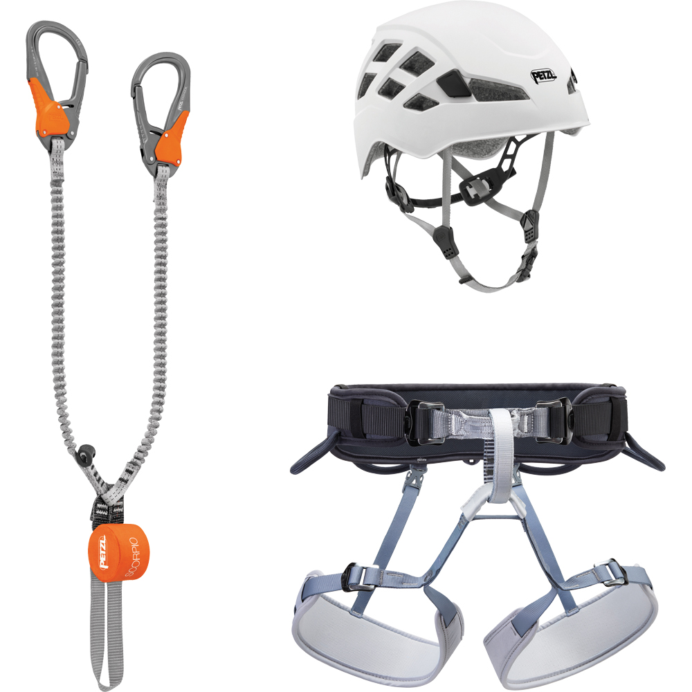 Klettersteig-Komplettset bestehend aus einem SCORPIO EASHOOK-Verbindungsmittel, einem CORAX-Klettergurt und einem BOREO-Helm Ein komfortables Komplettset zum Klettersteiggehen! Das KIT VIA FERRATA EASHOOK
