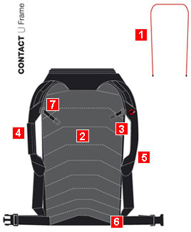 The U-shaped aluminium frame distributes the weight widely across the whole back. 2. Padded back Anatomically shaped, padded back and shoulder straps. 3. Opening on the back back opening with a circular zip for practical access to the main compartment. 4. Duffel-style handles The shoulder straps can be combined to form a handle. 5. Anatomically shaped shoulder straps 6. Stowable hip belt 7. Height-adjustable chest strap |