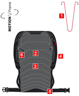 The flexible, anatomically pre-shaped aluminium V-frame effectively transfers the load across the hips while fully maintaining the freedom of movement of the upper body necessary for alpine pursuits. 2. Padded back Anatomically shaped, padded back and shoulder straps. 3. Stretch-fabric Soft, moisture-transporting stretch fabric. 4. Anatomically shaped shoulder straps 5. Stowable hip belt 6. Height-adjustable chest strap |
